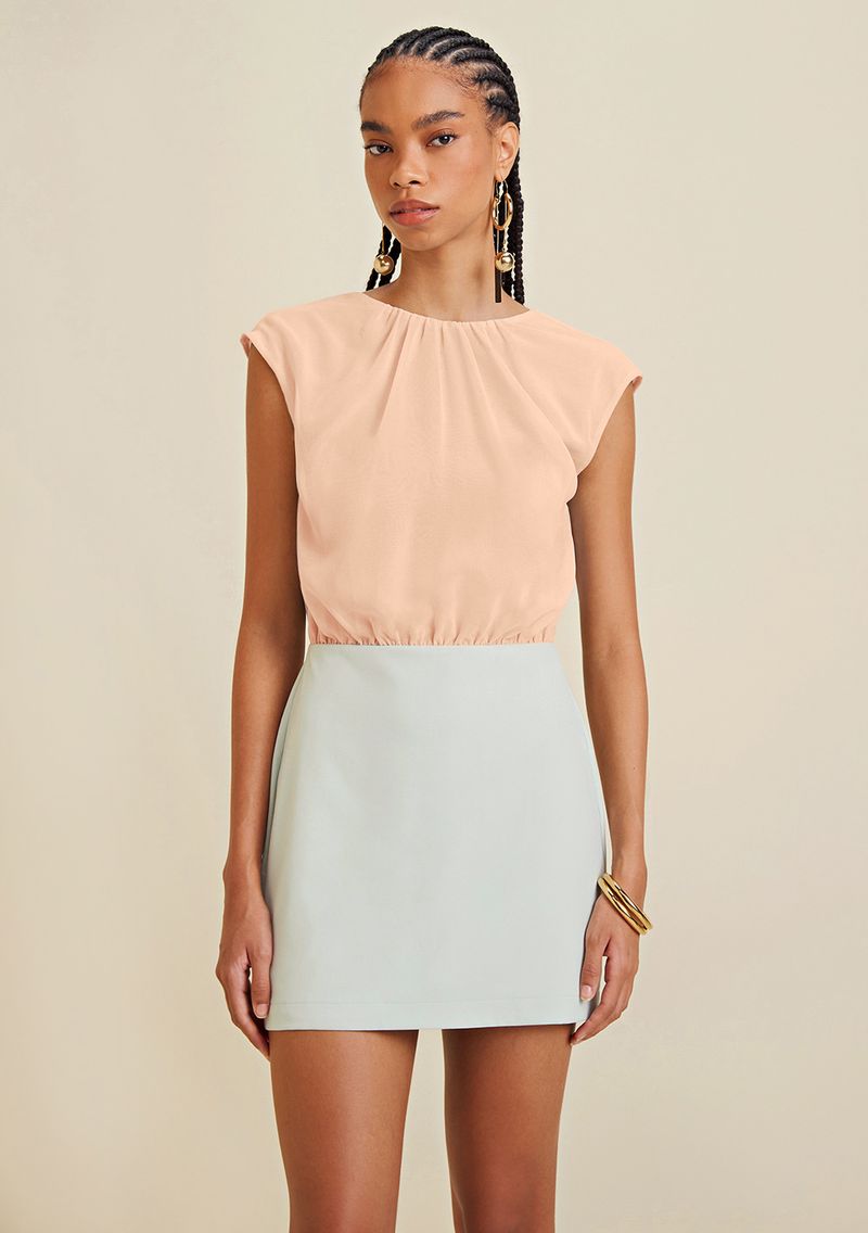 OUTLETLinhasColeçõesRoupasVestidosVestidosVestido Morena Rosa Curto Decote Redondo Abertura Costas Rosa