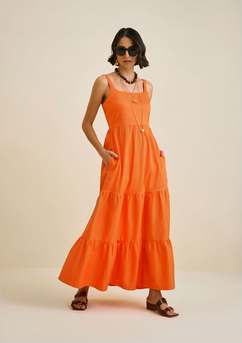 OUTLETLinhasColeçõesRoupasVestidosVestidosVestido Morena Rosa Longo Decote Reto Com Franzido Laranja