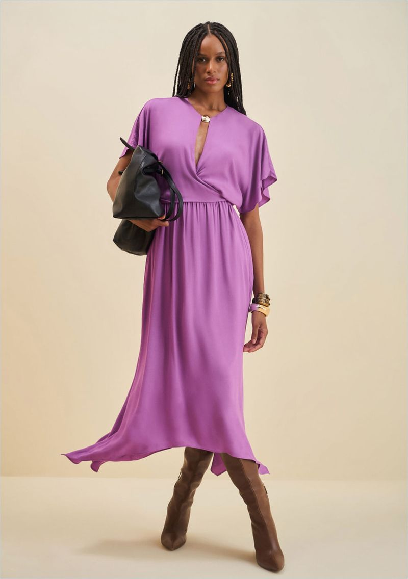 O Vestido Morena Rosa Solto Decote Careca Manga Curta Midi Lilás é a expressão máxima da sofisticação e elegância. Com um design encantador, ele realça a beleza feminina com cores vibrantes e recortes inusitados, alinhados à essência boêmia da coleção de inverno. Feito 100% em viscose, proporciona leveza e conforto, ideal para ocasiões casuais ou eventos especiais. Combine-o com sandálias de tiras e acessórios delicados para um look que transita do dia à noite com facilidade. A coleção resgata a vibração da terra, trazendo tons que evocam a natureza e babados que conferem movimento, refletindo a liberdade do espírito boêmio. Os acessórios não acompanham a peça.