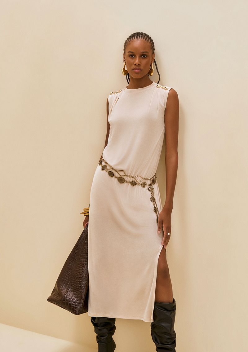 Vestido Morena Rosa Solto Decote Careca Sem Manga Midi Bege
