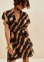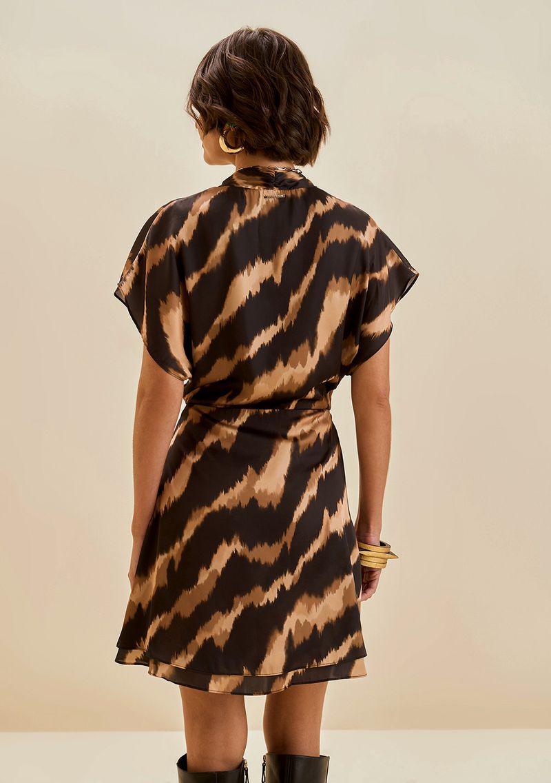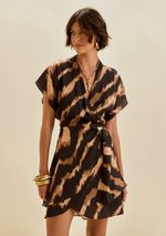 Vestido Morena Rosa Solto Decote Transpassado Manga Curta Curto Marrom