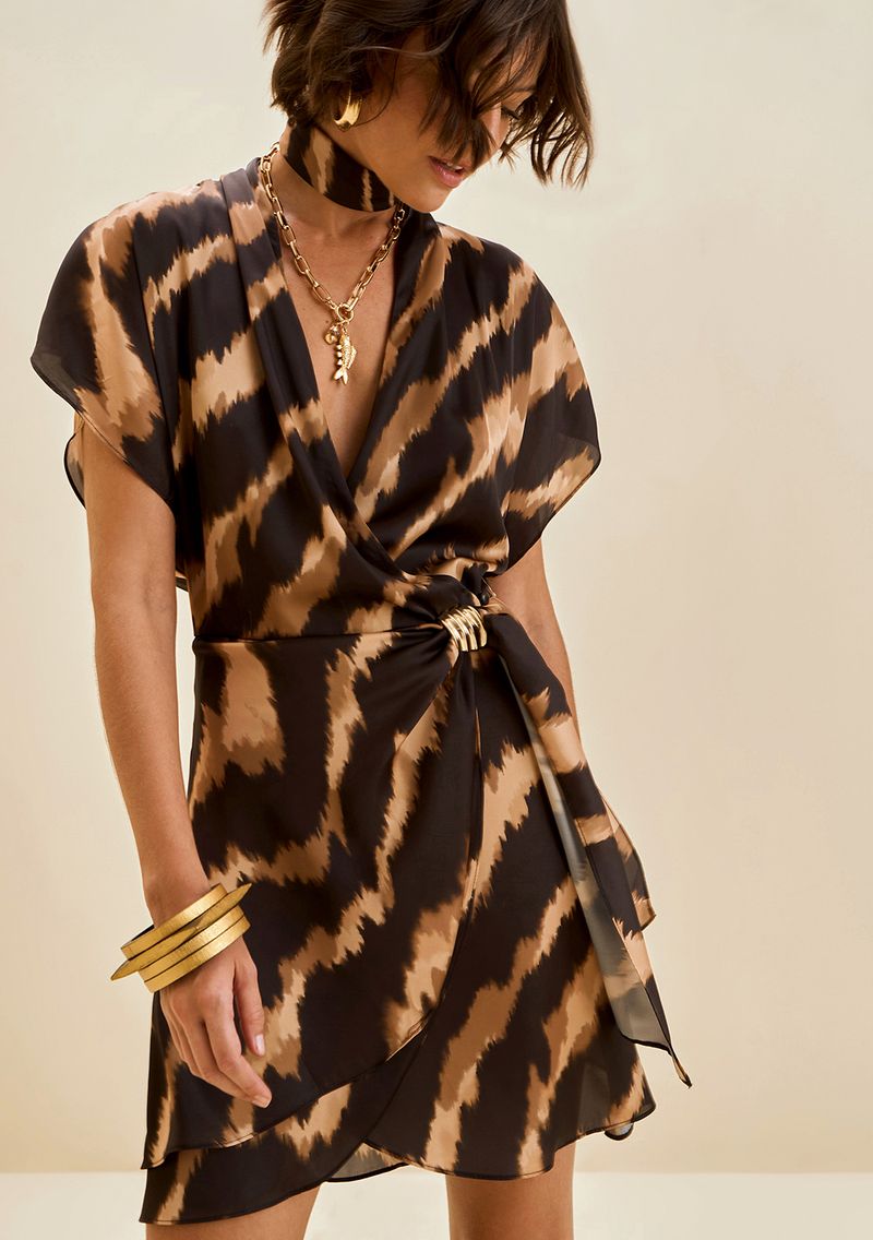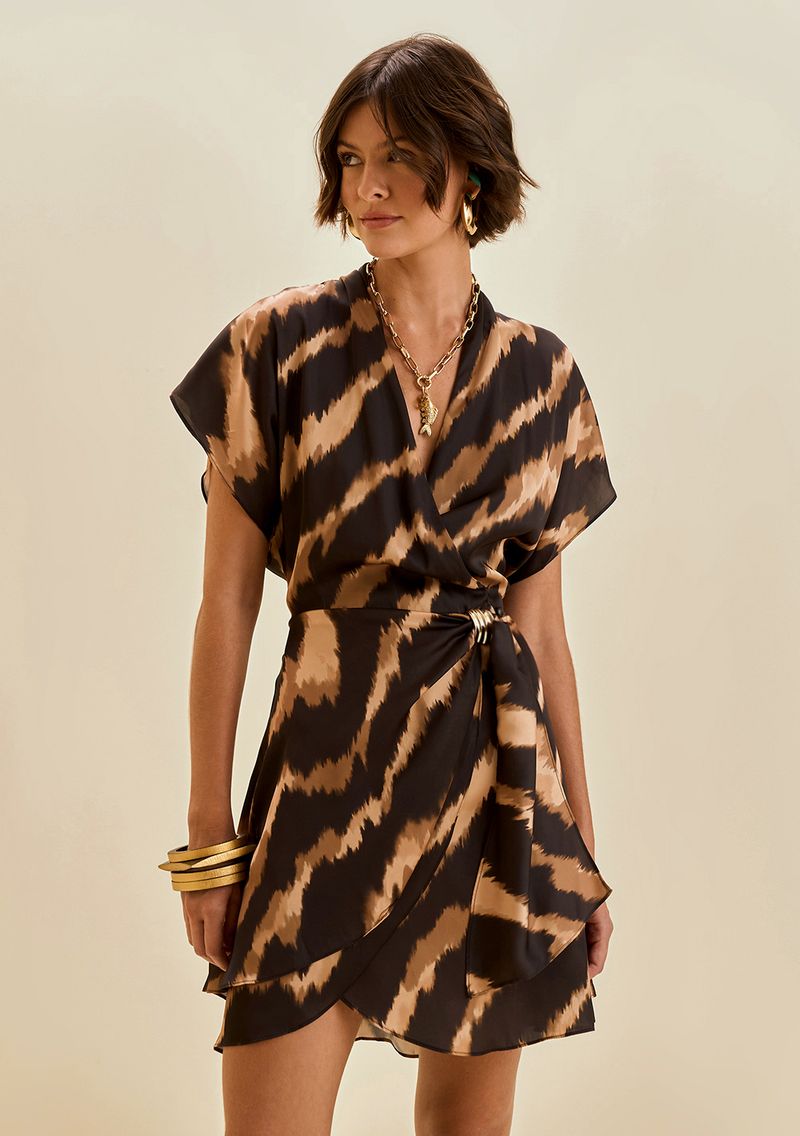 OUTLETLinhasColeçõesRoupasVestidosVestidosVestido Morena Rosa Solto Decote Transpassado Manga Curta Curto Marrom