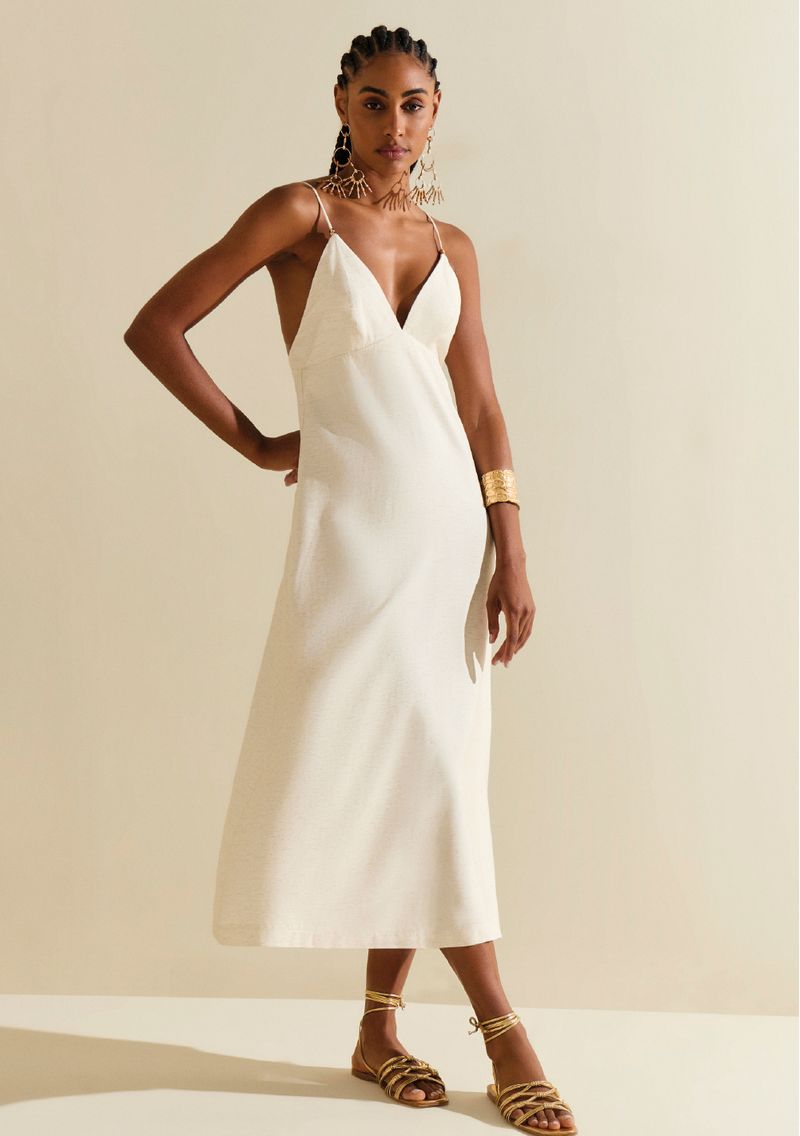 Envolva-se na sofisticação do Vestido Morena Rosa Solto Decote V Com Alça Midi Off White. Com um design que exalta a beleza feminina, este vestido é a escolha perfeita para quem busca elegância e autenticidade. Seu decote V e comprimento midi proporcionam um caimento impecável, enquanto a combinação de viscose, linho e outras fibras oferece leveza e conforto. Ideal para ocasiões que vão do casual ao elegante, ele se transforma em uma peça versátil no guarda-roupa. Combine-o com sandálias de salto para um jantar especial ou com rasteiras para um look diurno. Inspirado na vibrante coleção Recife, que celebra a brasilidade e o verão, este vestido promete fazer você brilhar em qualquer cenário. Vale lembrar que os acessórios não acompanham a peça.