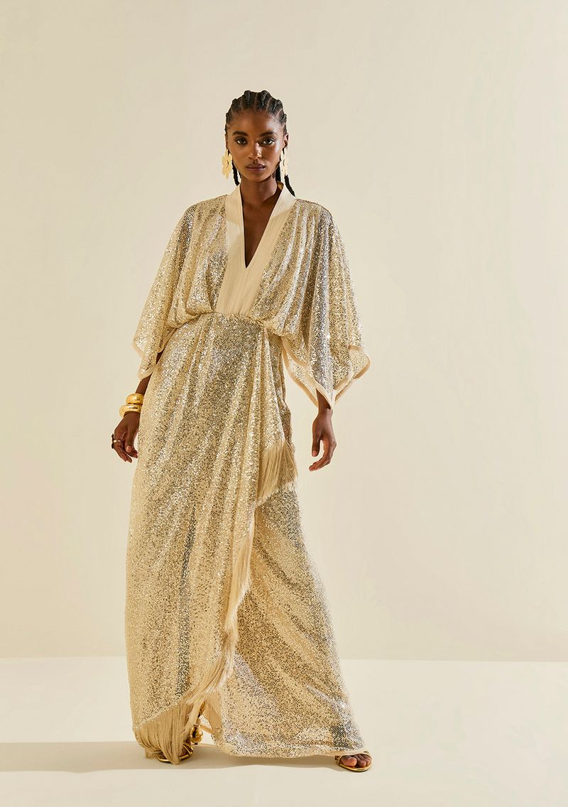O Vestido Morena Rosa Solto Decote V Manga Curta Longo na tonalidade bege é a peça ideal para a mulher moderna que deseja se sentir confiante e elegante em qualquer ocasião. Com um design que realça a silhueta feminina, sua combinação de texturas e recortes transmite sofisticação e charme. O decote V valoriza o colo, enquanto as mangas curtas proporcionam leveza. Perfeito para eventos sociais ou para um passeio descontraído, ele pode ser facilmente combinado com uma sandália de tiras e acessórios dourados para um toque glamouroso. Aposte em um look deslumbrante e radiante, celebrando sua autenticidade. Os acessórios não acompanham a peça.