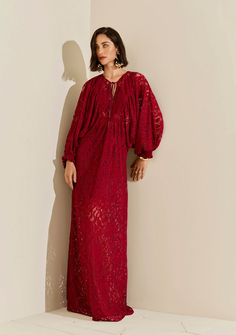 Vestido Morena Rosa Solto Decote V Manga Longa Longo Bordo