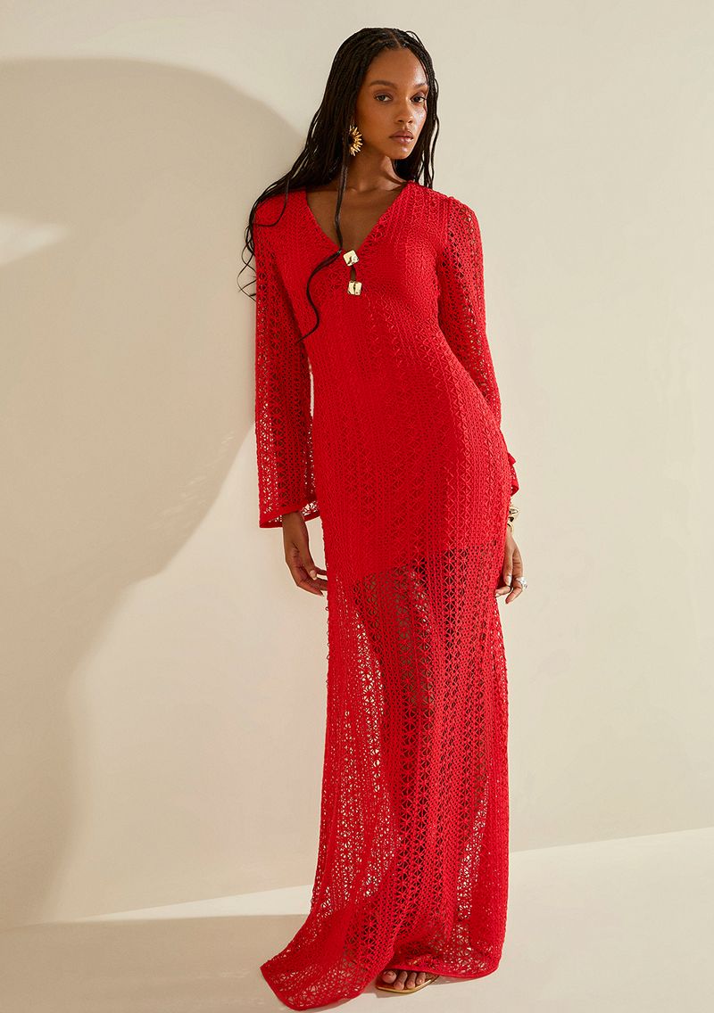 Vestido Morena Rosa Solto Decote V Manga Longa Longo Vermelho
