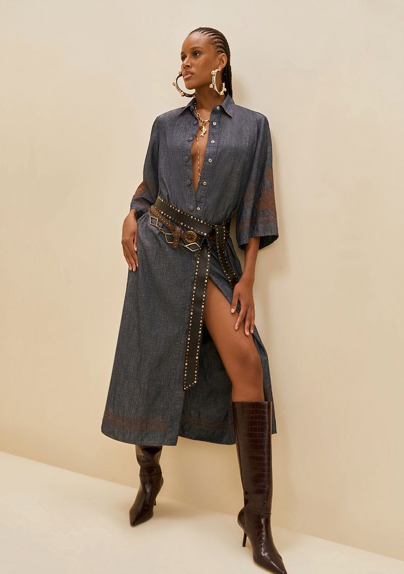 Vestido Morena Rosa Solto Polo Manga Curta Longo Azul