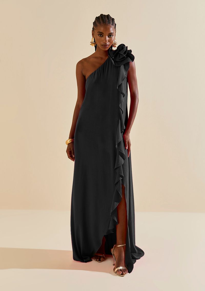 Vestido Morena Rosa Solto Um Ombro Só Sem Manga Longo Preto