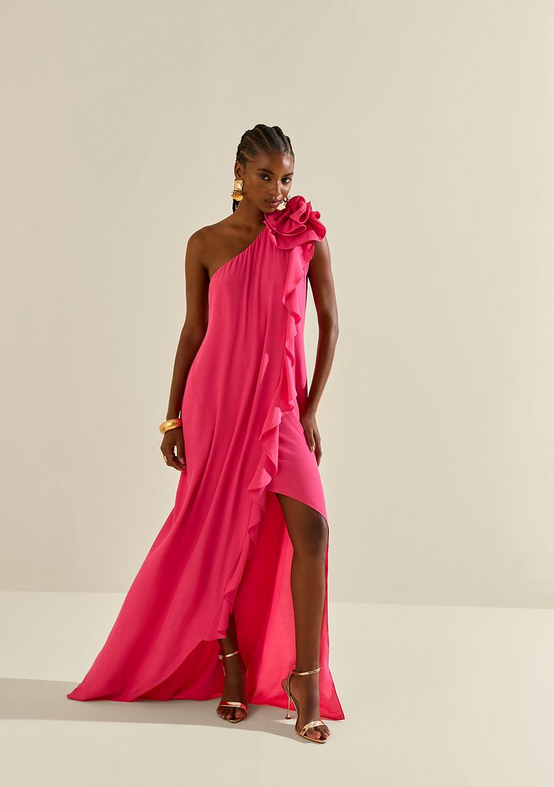 Vestido Morena Rosa Solto Um Ombro Só Sem Manga Longo Rosa