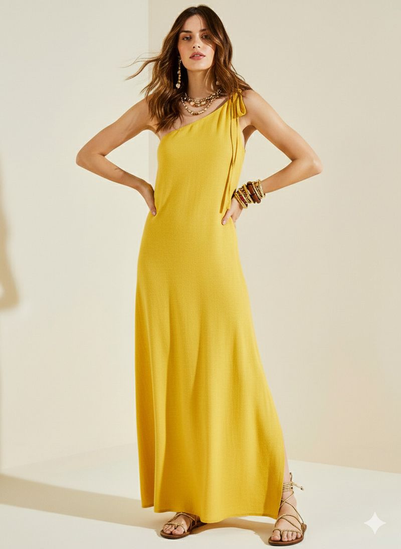 Vestido Morena Rosa Solto Um Ombro Só Sem Manga Midi Amarelo