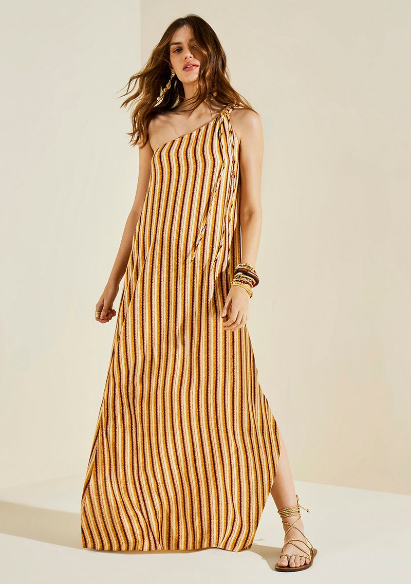 Vestido Morena Rosa Solto Um Ombro Só Sem Manga Midi Laranja